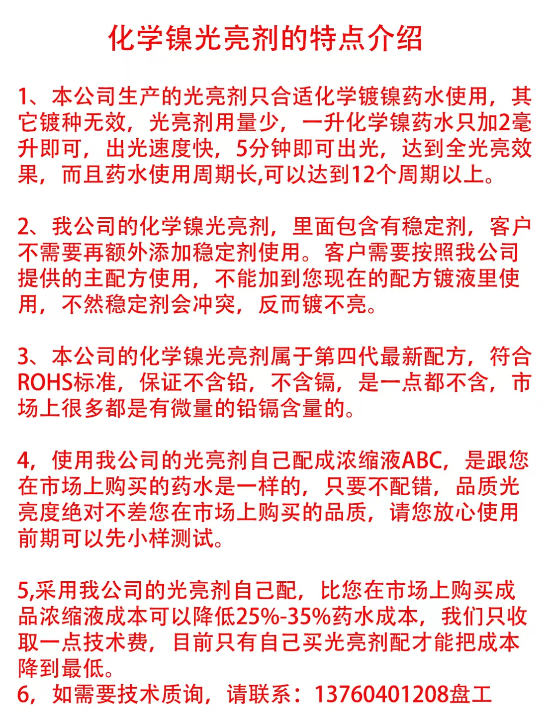 用于化學(xué)鎳中作為、光亮劑、穩(wěn)定劑、絡(luò)合劑、作用,具有快速出光、鍍層細(xì)膩、鍍速快、穩(wěn)定性好,使用周期長等優(yōu)點(diǎn)。 |